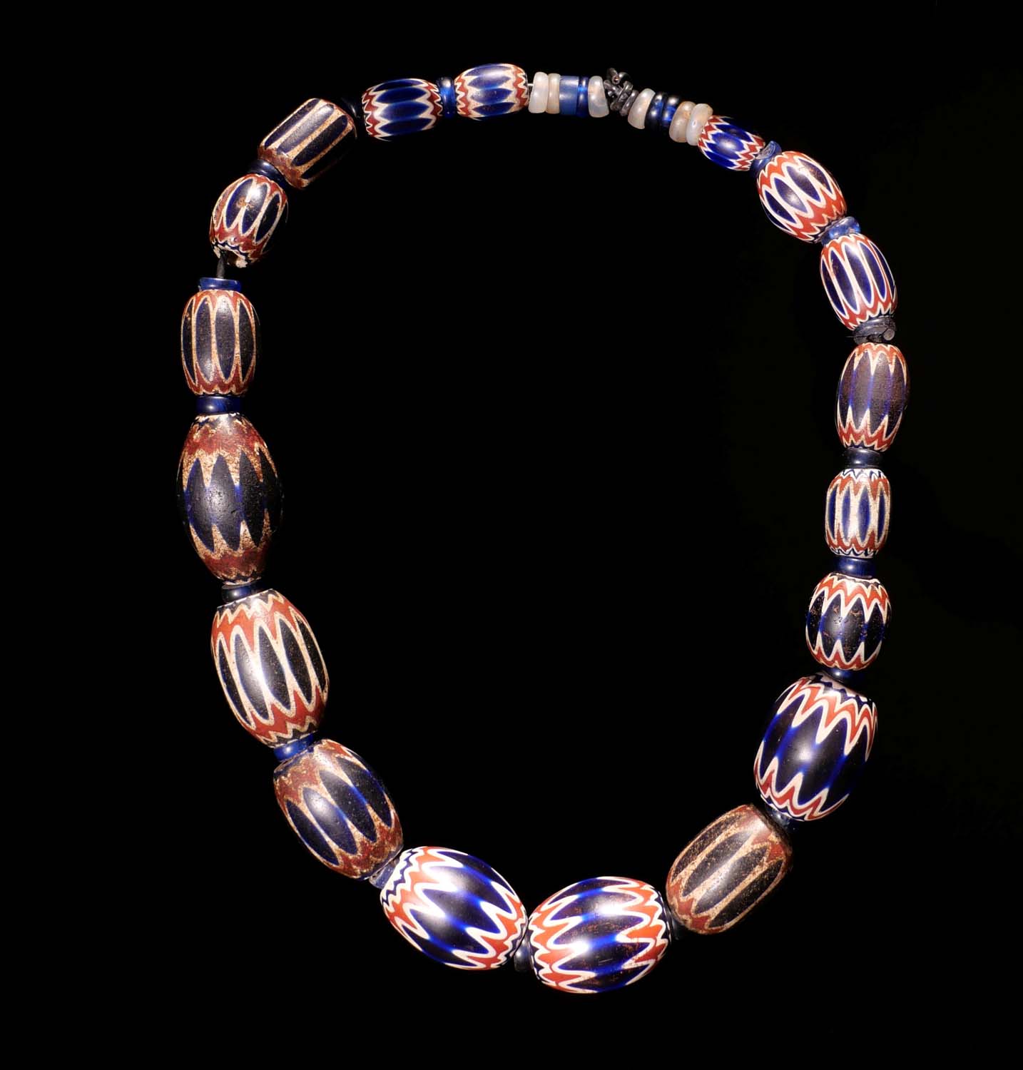 Prachtvolle Kette aus „Chevron" - Glasperlen. Getragen von mächtigen Häuptlingen im Kongo. Venedig 16. - 19. Jhdt. Größte Perle L 6 cm. Priv.Slg. Landau. 3000.- €