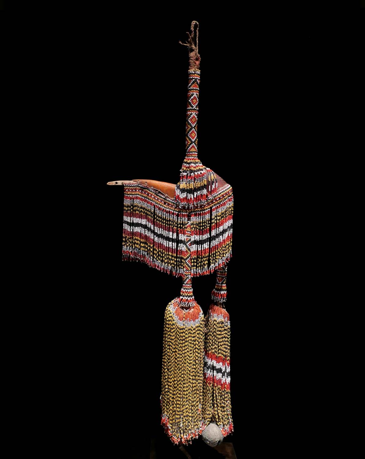 Außergewöhnliches Kriegerschwert-Glasperlen-Gehänge. Westborneo/Sarawak, 19. – frühes 20. Jhdt. Glasperlen, Bronzeglöckchen, Nashornvogel-Schnabel, Holz