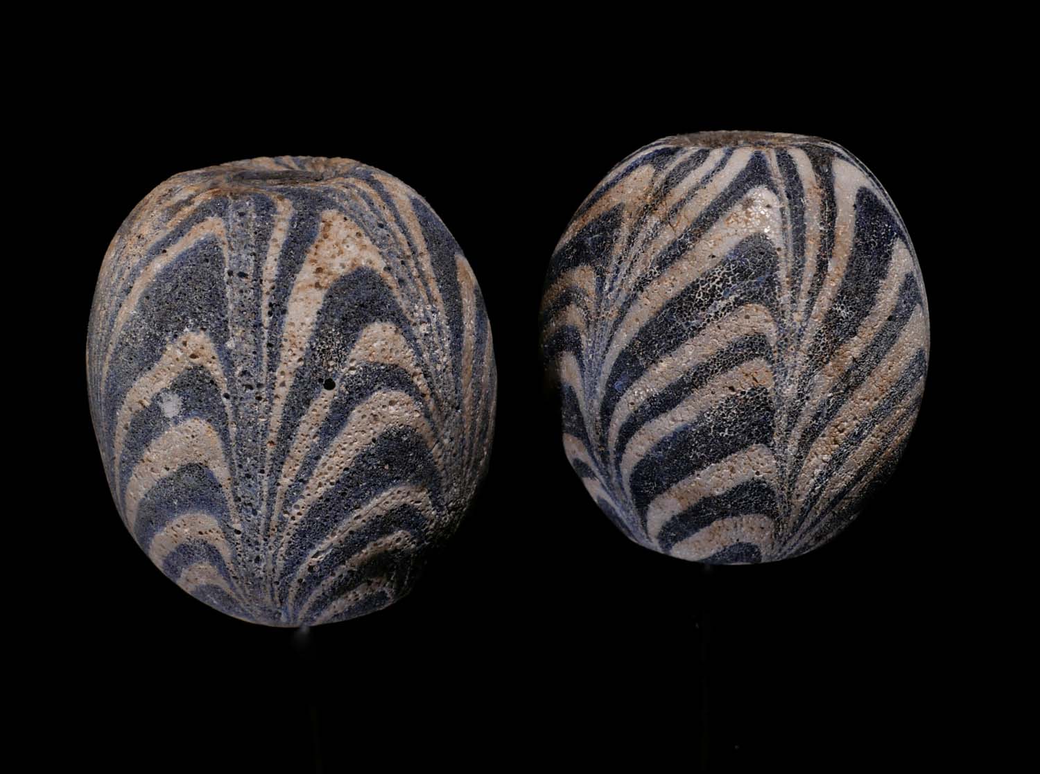 Zwei seltene, ungewöhnlich große Jatim-Glasperlen, Java, Majapahit, 14.–15. Jahrhundert. Blau-weiße Perlen: 6 cm, 5,7 cm. Priv.Slg. Niederlande. Paar 1200.- €