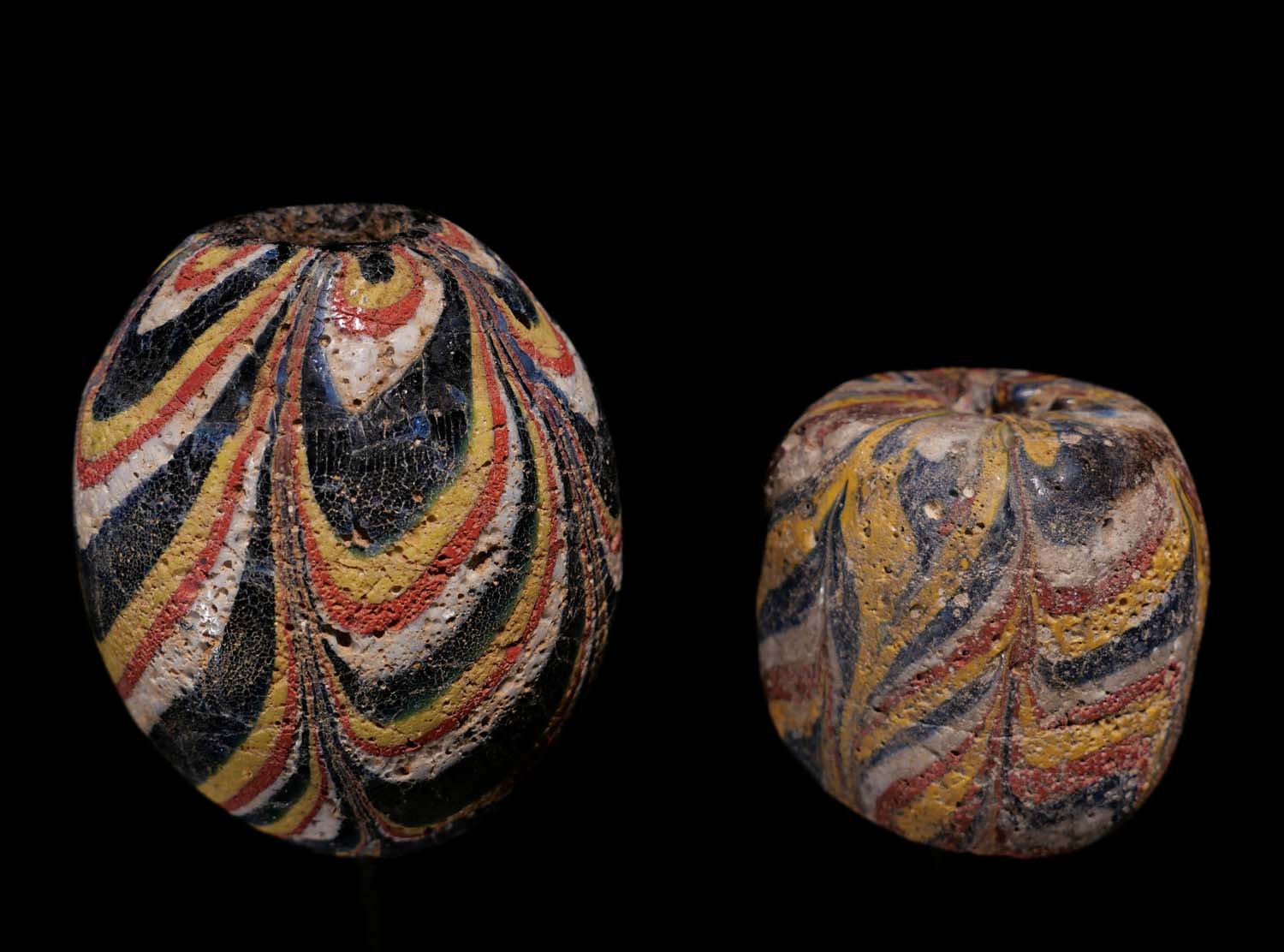 Zwei seltene, ungewöhnlich große Jatim-Glasperlen, Java, Majapahit, 14.–15. Jahrhundert. Mehrfarbig 5,7 cm, 3,9 cm. Priv.Slg. Niederlande. Paar 1200.- €