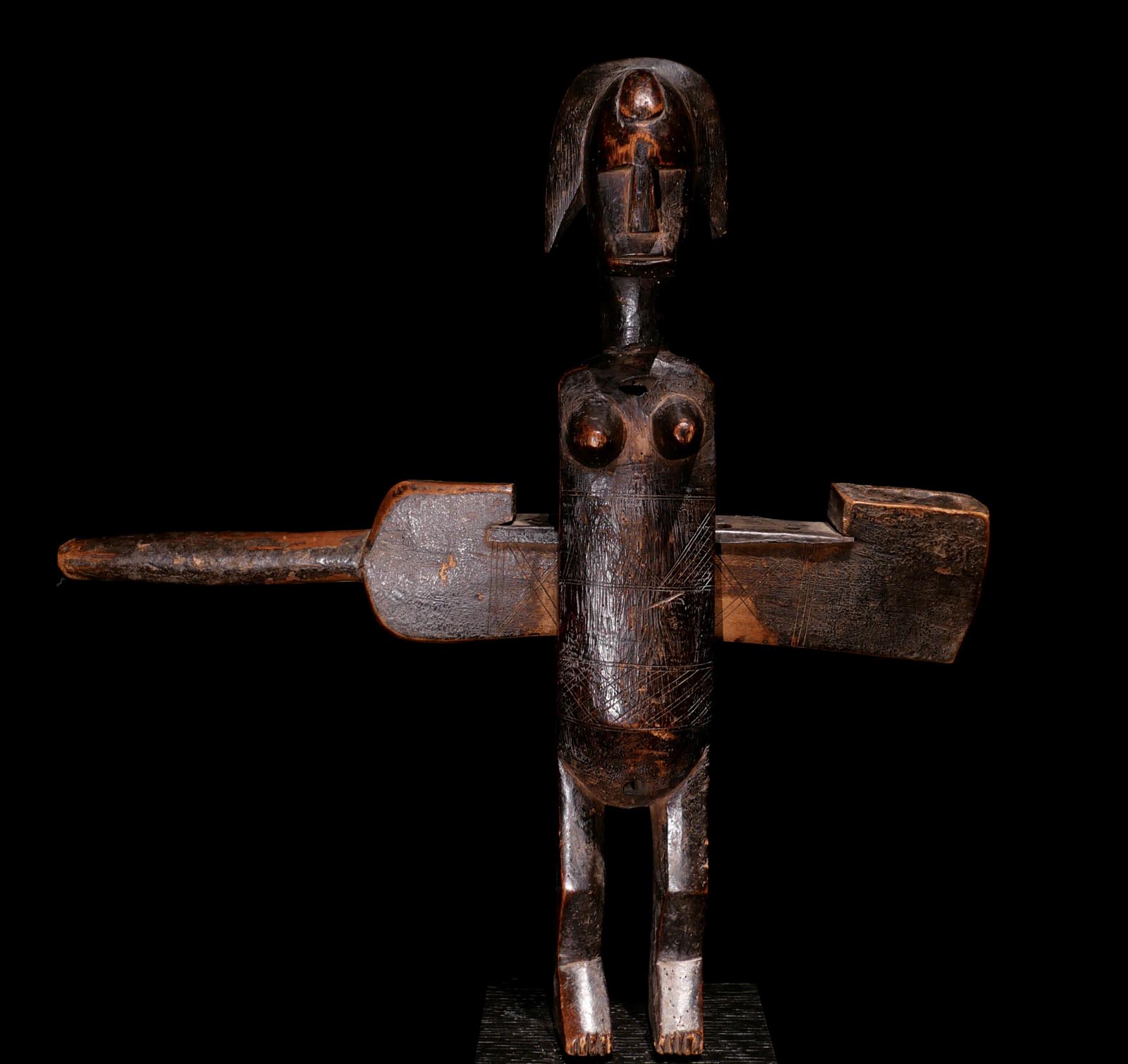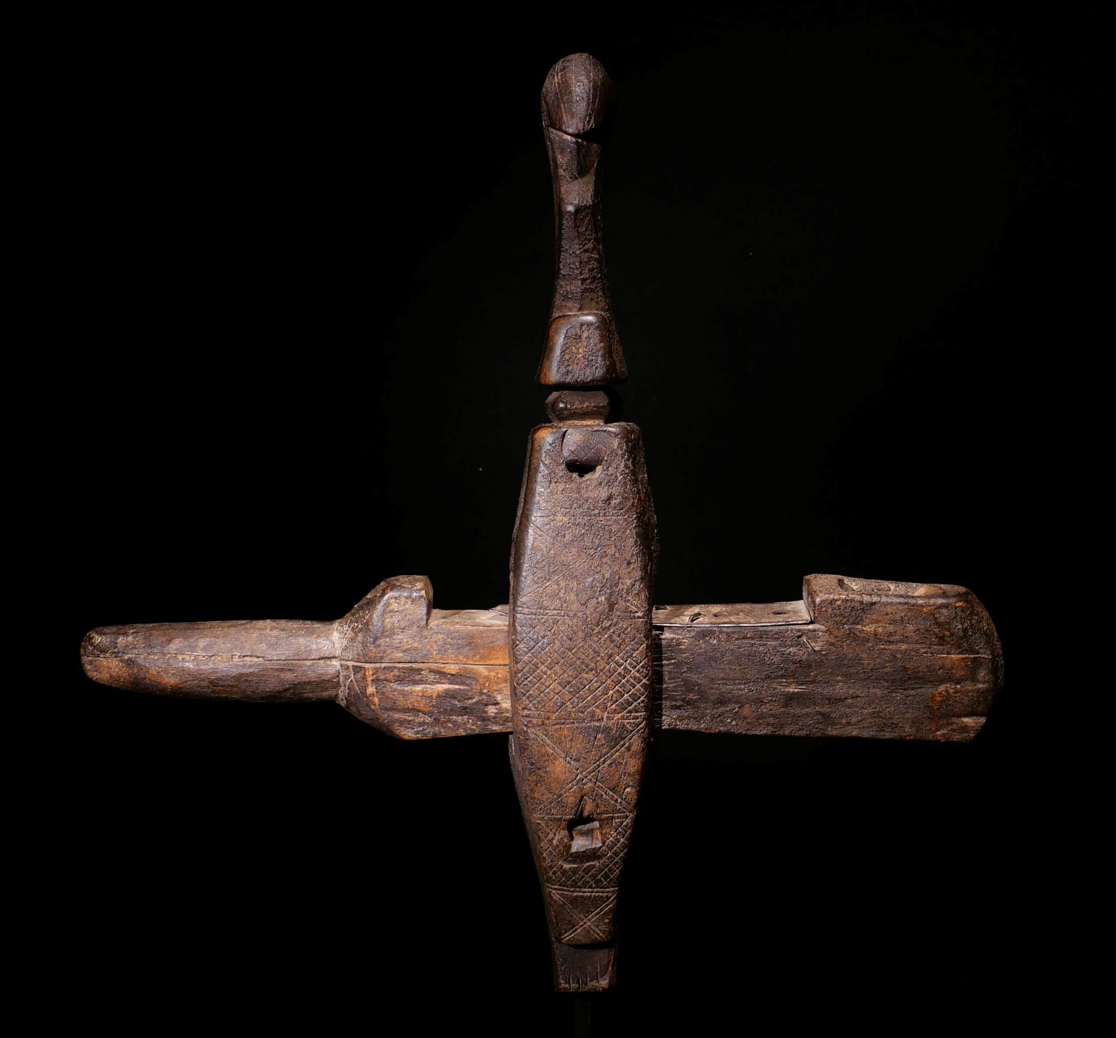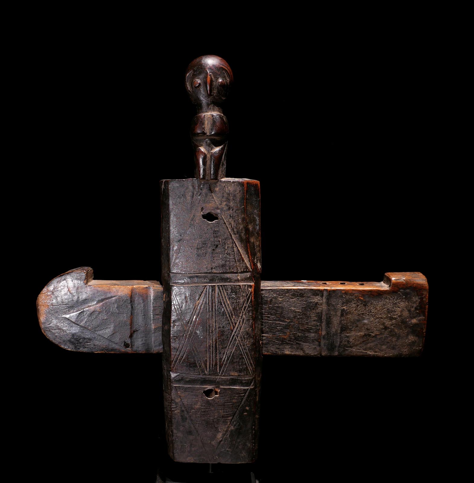 Webrollenhalter. Holz, feine dunkle Patina. Dogon / Mali. Mitte 20.Jhdt. Ex.Slg. Pfaffhausen / Mannheim. H 19 cm. 800.- €