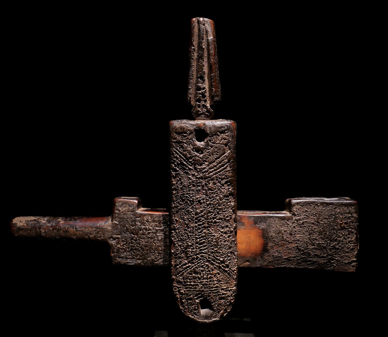 Türschloss mit Riegel, Holz, Eisen. Bambara, Werkstatt Koulikoro-Region / Mali. Anfang 20. Jhdt. Ex.Slg. H. Pfaffhausen, Mannheim. H 40 cm. 800.- €