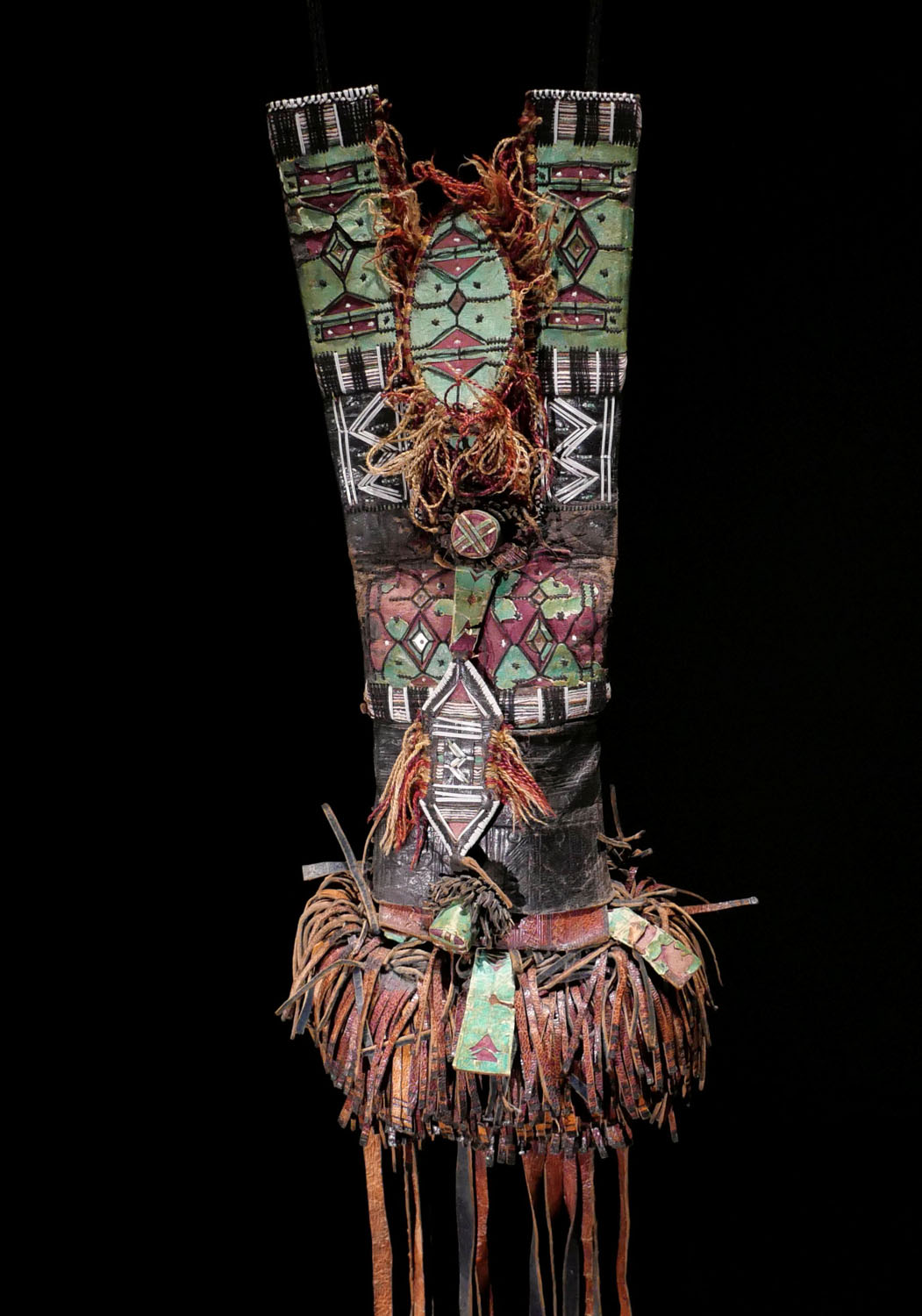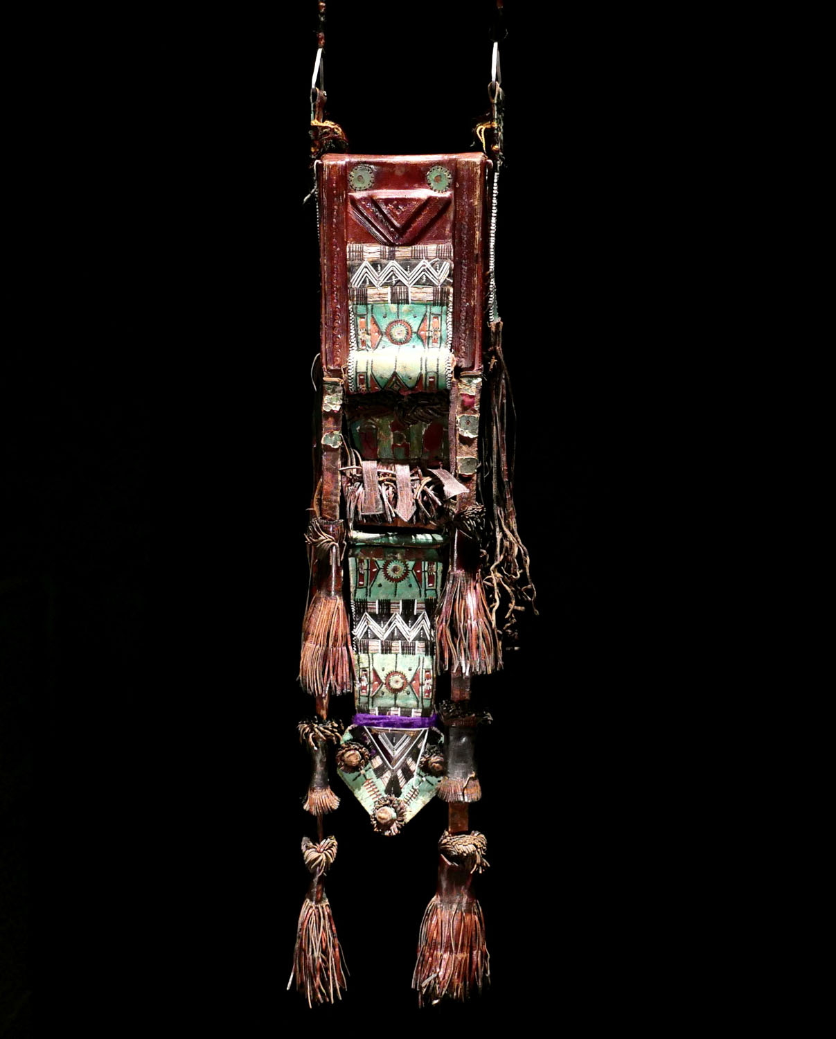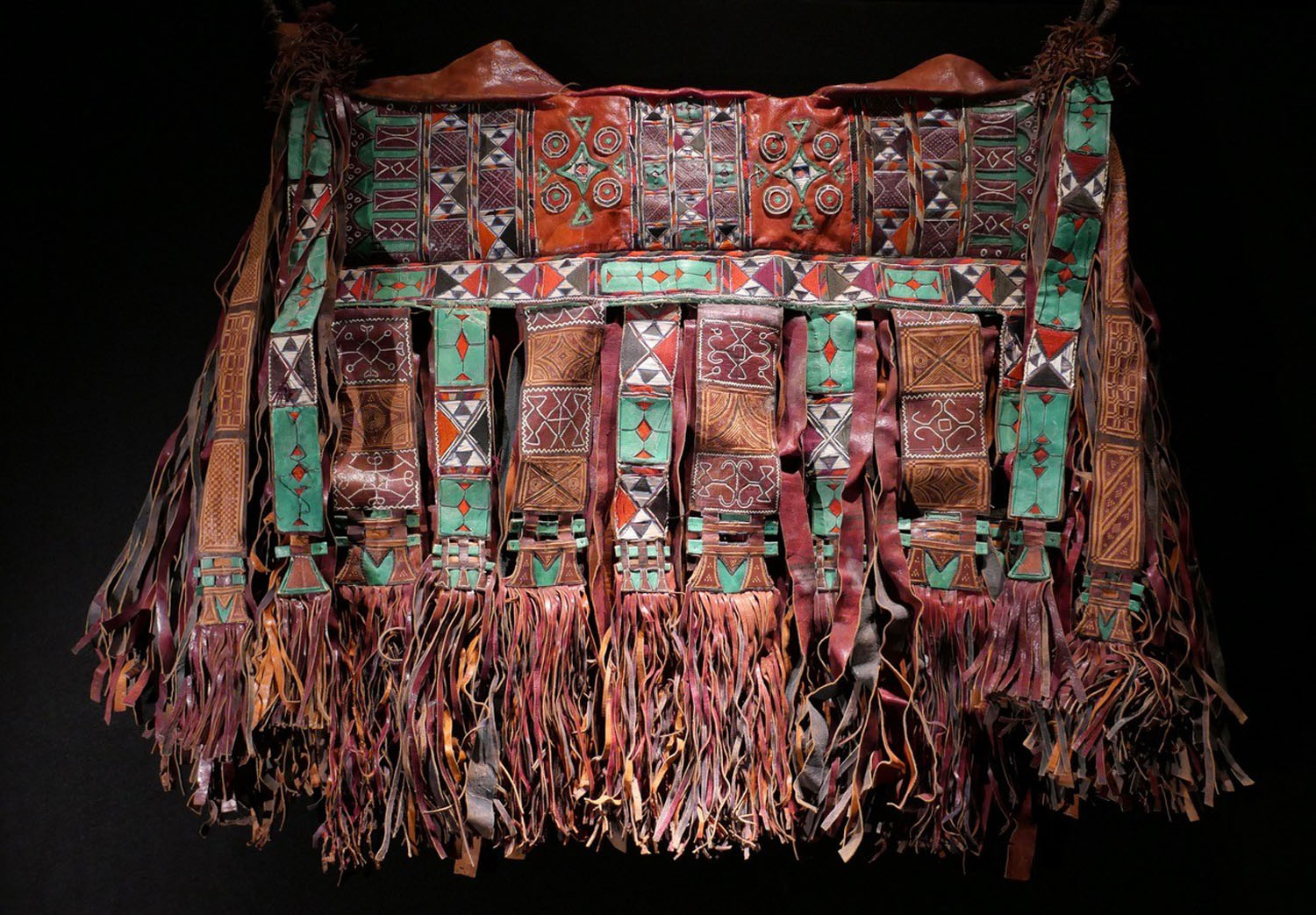 Brusttasche für Männer. Touareg, Mali / Niger. Grün und rot gefärbtes Leder, reich bestickt. Mit tiefem Innenfach. Mitte 20.Jhdt. Gesamtlänge 55 cm, B 12 cm. 350.- €