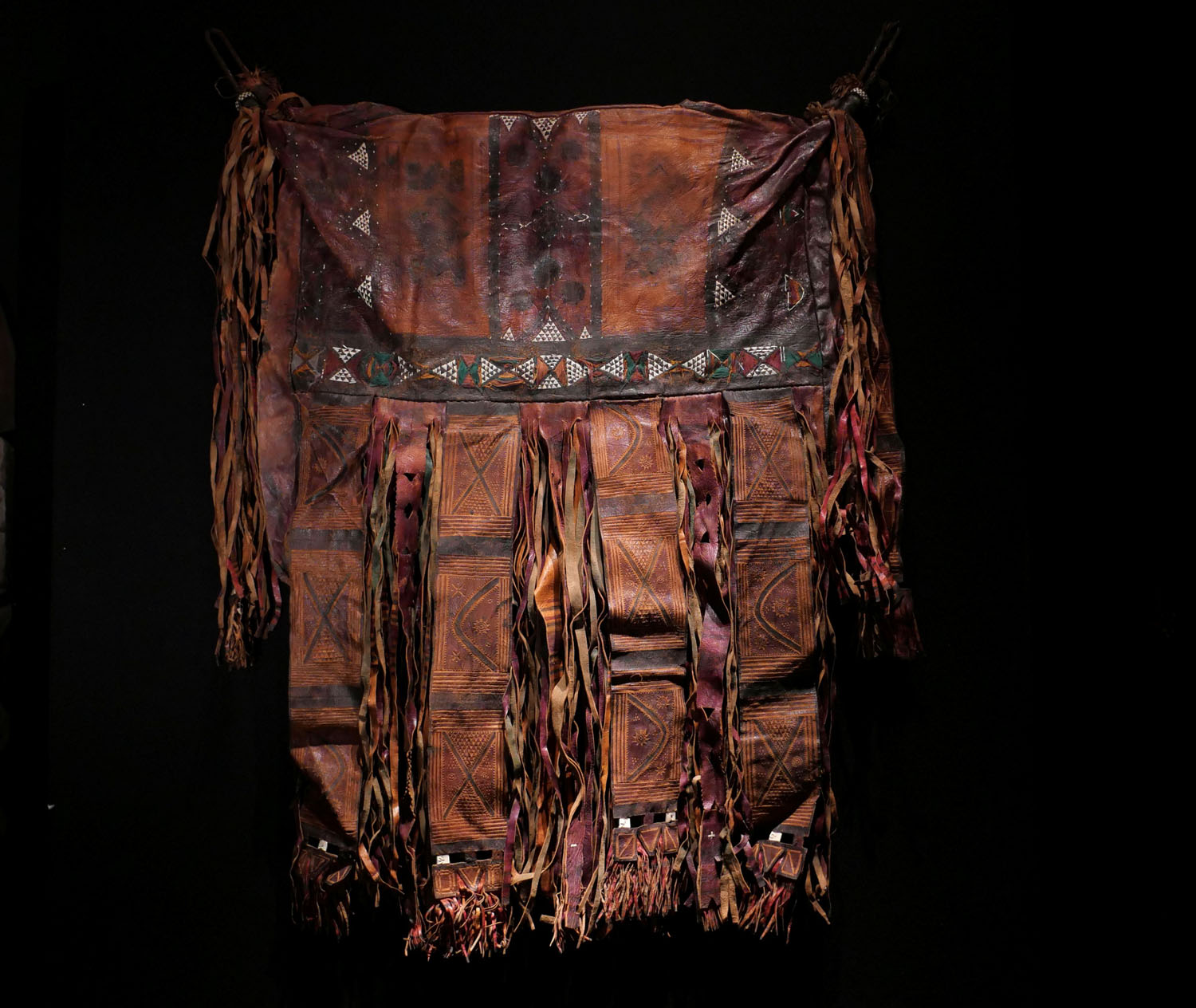 Reise-Tasche für Frauen. Touareg / Niger / Mali. Reich besticktes und verziertes Kamel- und Ziegenleder. Die Tasche wurde seitlich am Kamel befestigt. Sie enthielt die Kleider und Habseligkeiten der Touareg Familien. Mitte 20.Jhdt. B 60 cm, H 80 cm. 400.- €