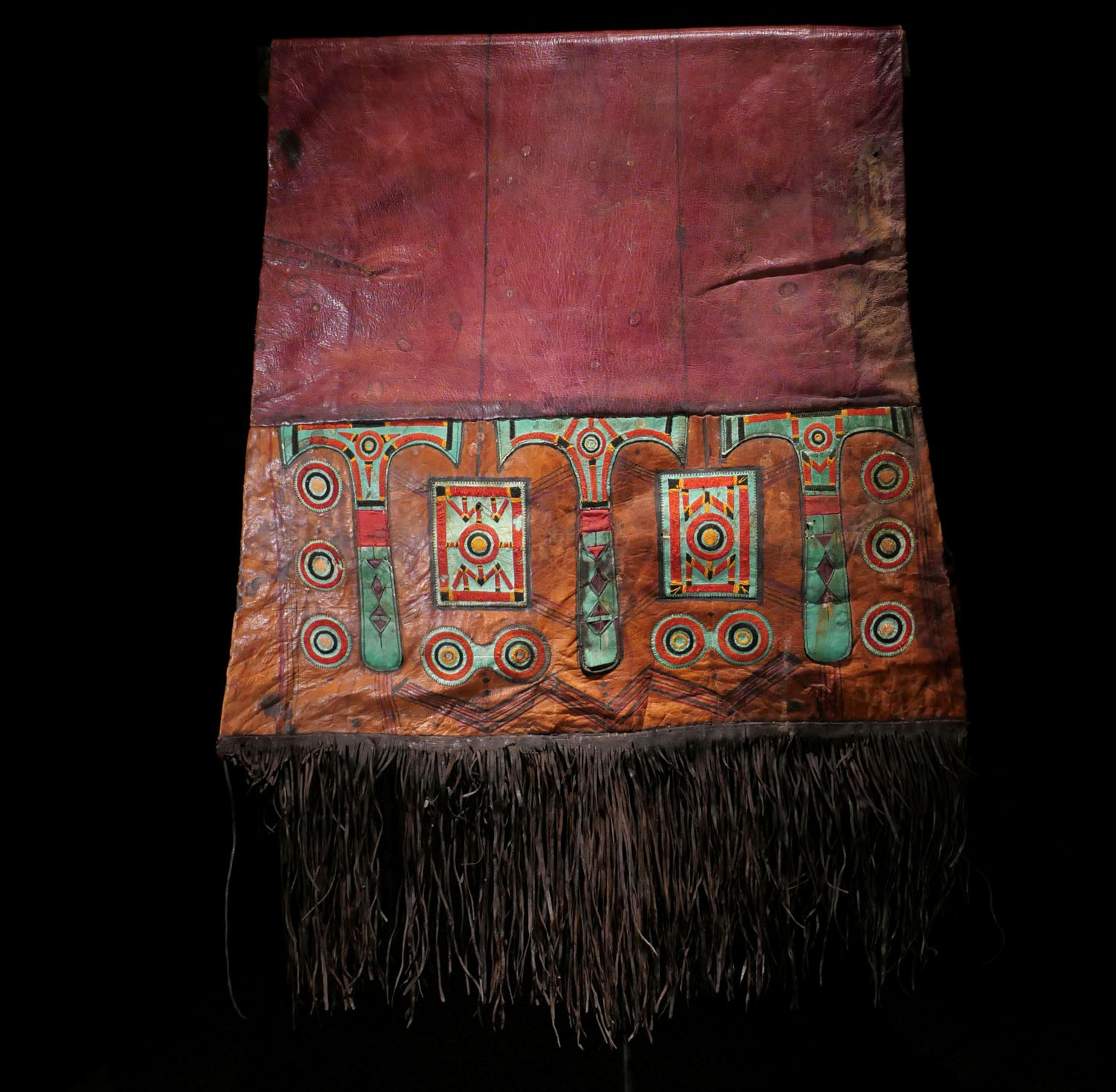 Kissen aus Leder. Touareg, Mali / Niger. Gefärbt und reich bestickt. Das Kissen wurde mit Stroh ausgestopft und im Zelt als Rückenlehne verwendet. Mitte 20. Jhdt. Länge 120 cm, plus Fransen, B 60 cm. 350.- €
