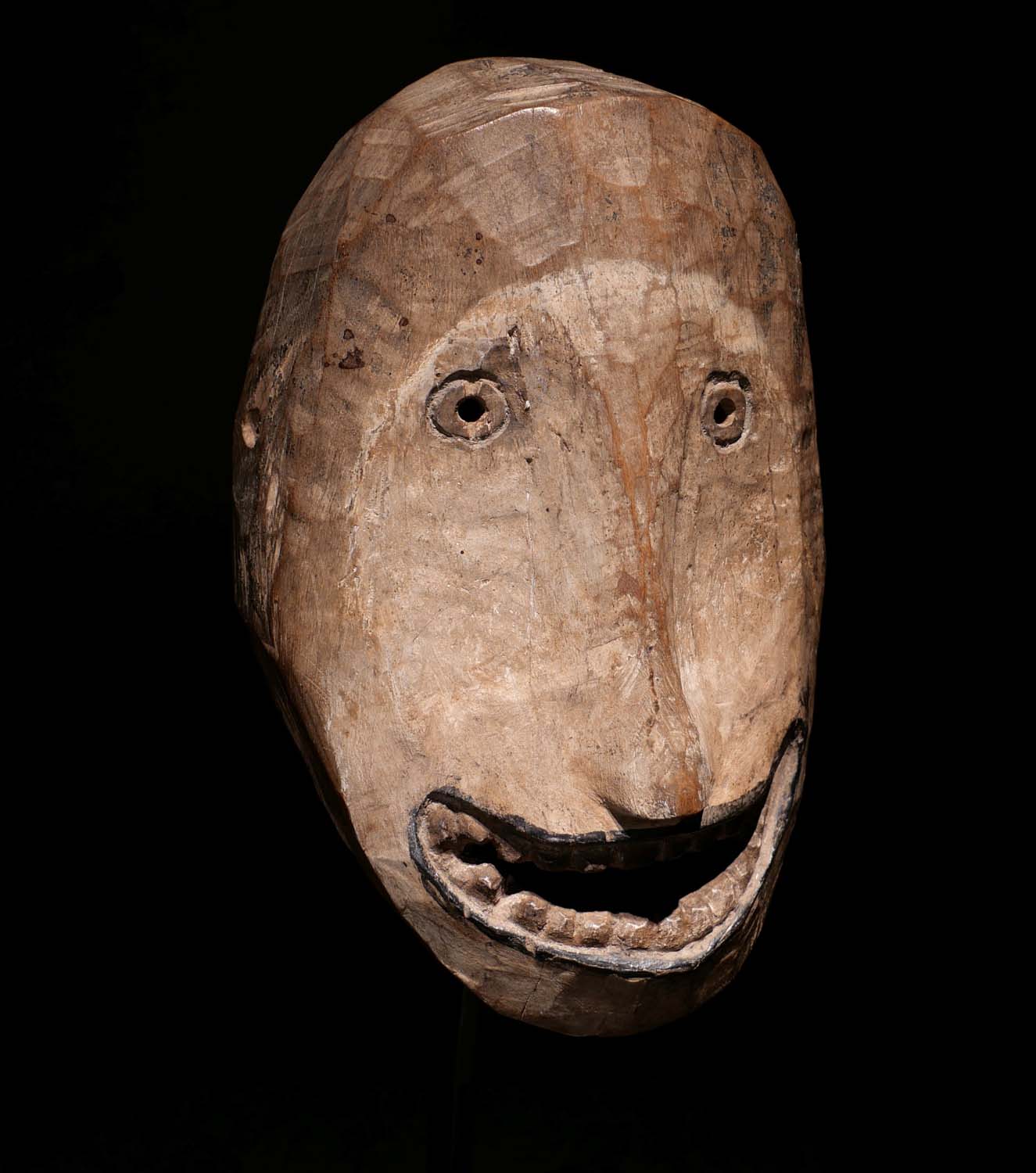 Seltene Gesichtsmaske für den Barong Brutuk-Tanz. Holz, Farb-Pigmente. H 18,8 cm. Bali, Provinz Bangli, Insel Trunyan, Bali Aga. Ende des 19. / Anfang des 20. Jhdt. Prv.Slg Niederlande. 3200.- €