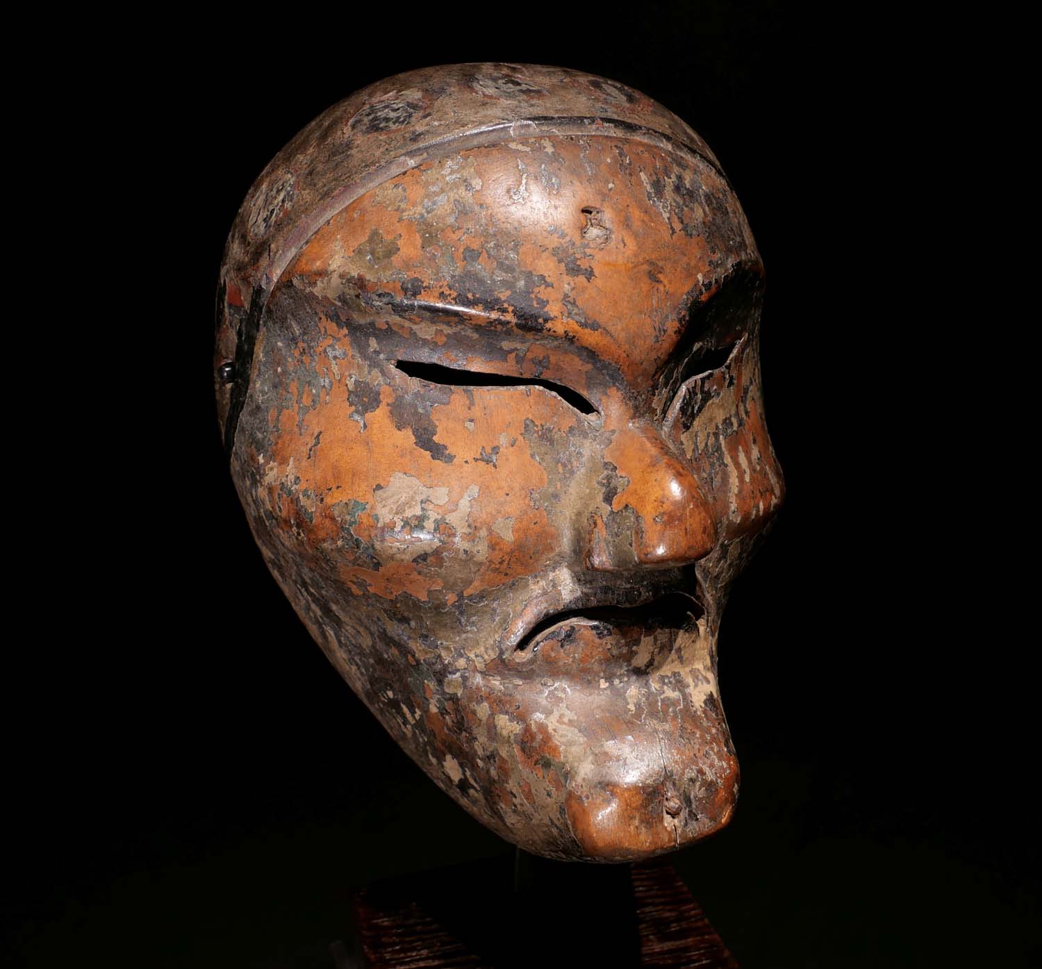Seltene, frühe Palast-Maske (möglicherweise Topeng Kelana?), West-Java, Cirebon Palast, 19. Jhdt. oder früher. Holz, Farb-Pigmente. H 17 cm x B 13 cm. Priv.Slg. Frankreich/Schweiz (seit den 1970er Jahren). 4300.- €