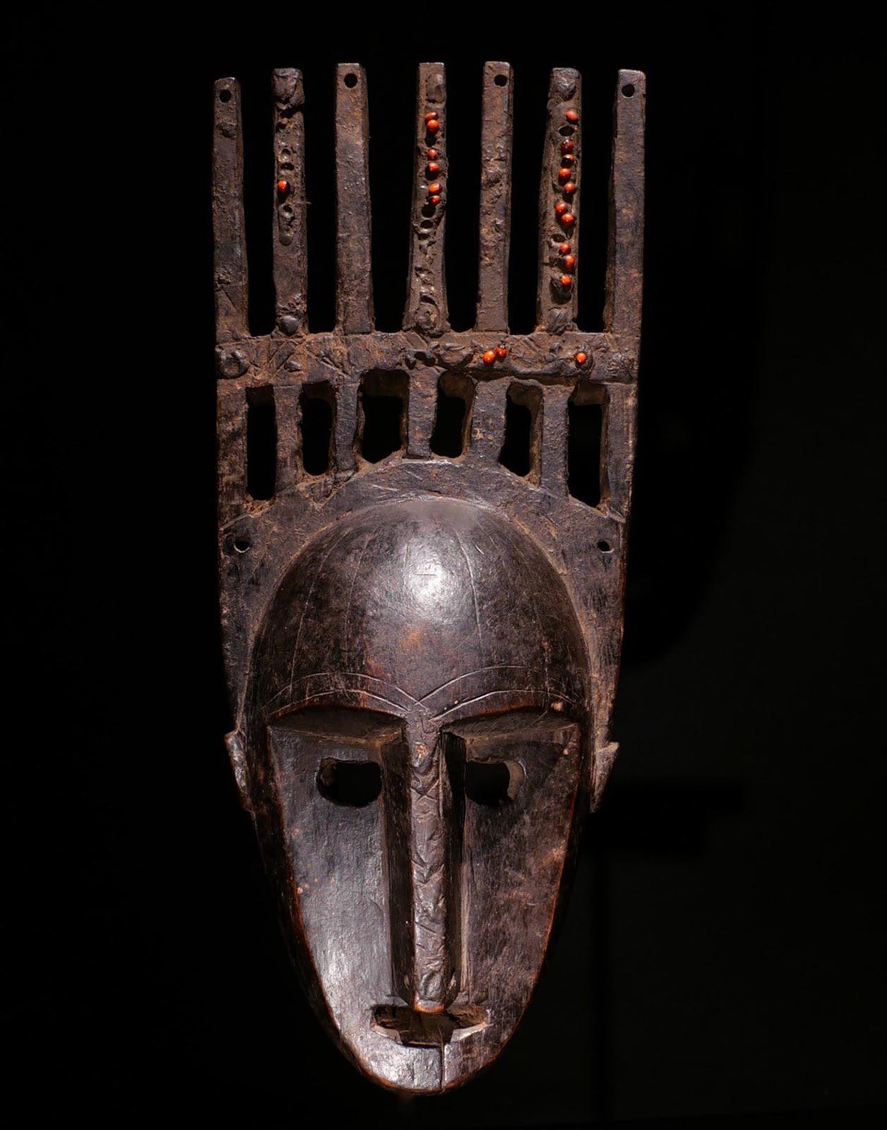 Tanzmaske „Ntomo“. Getanzt bei Initiations-Festen. Holz, Abrusbohnen, dunkle Patina. Bambara, Region Sikasso / Mali. Frühes 20.Jhdt. Ex.Slg. H. Pfaffhausen, Mannheim. H 34 cm, 2200.- €