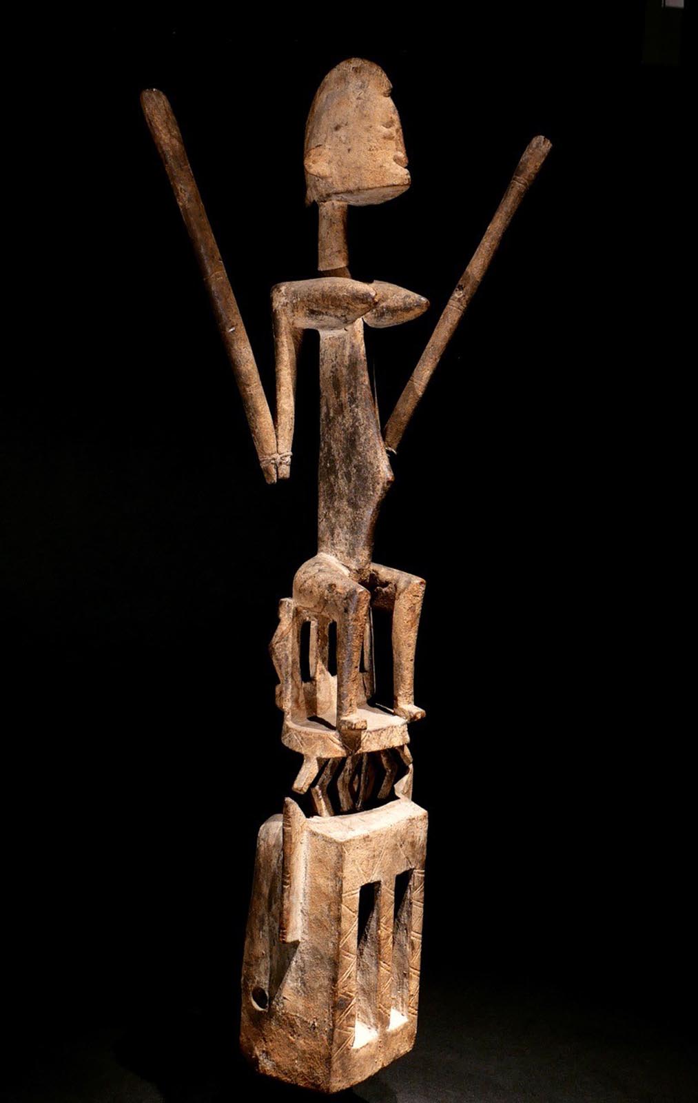 Tanzmaske „Satimbe“. Getanzt beim Dama, dem Ritual zu Ehren der Verstorbenen. Holz, Reste von Bemalung. Dogon, Region Sanga / Mali. Ex.Slg. Pfaffhausen / Mannheim. H 99 cm, 3200.- €