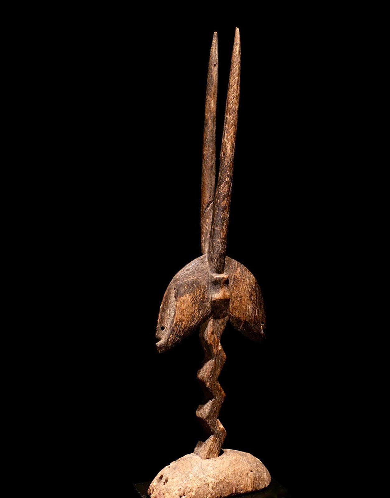 Abstrakter, sehr seltener Tanzaufsatz „Chiwara“. Abstrakte Darstellung einer Antilope. Getanzt bei Initiationsfeierlichkeiten. Segou-Region, Bambara / Mali. Mitte 20.Jhdt. Ex.Slg. Helmuth Pfaffhausen, Mannheim. H 47 cm. 2000.- €
