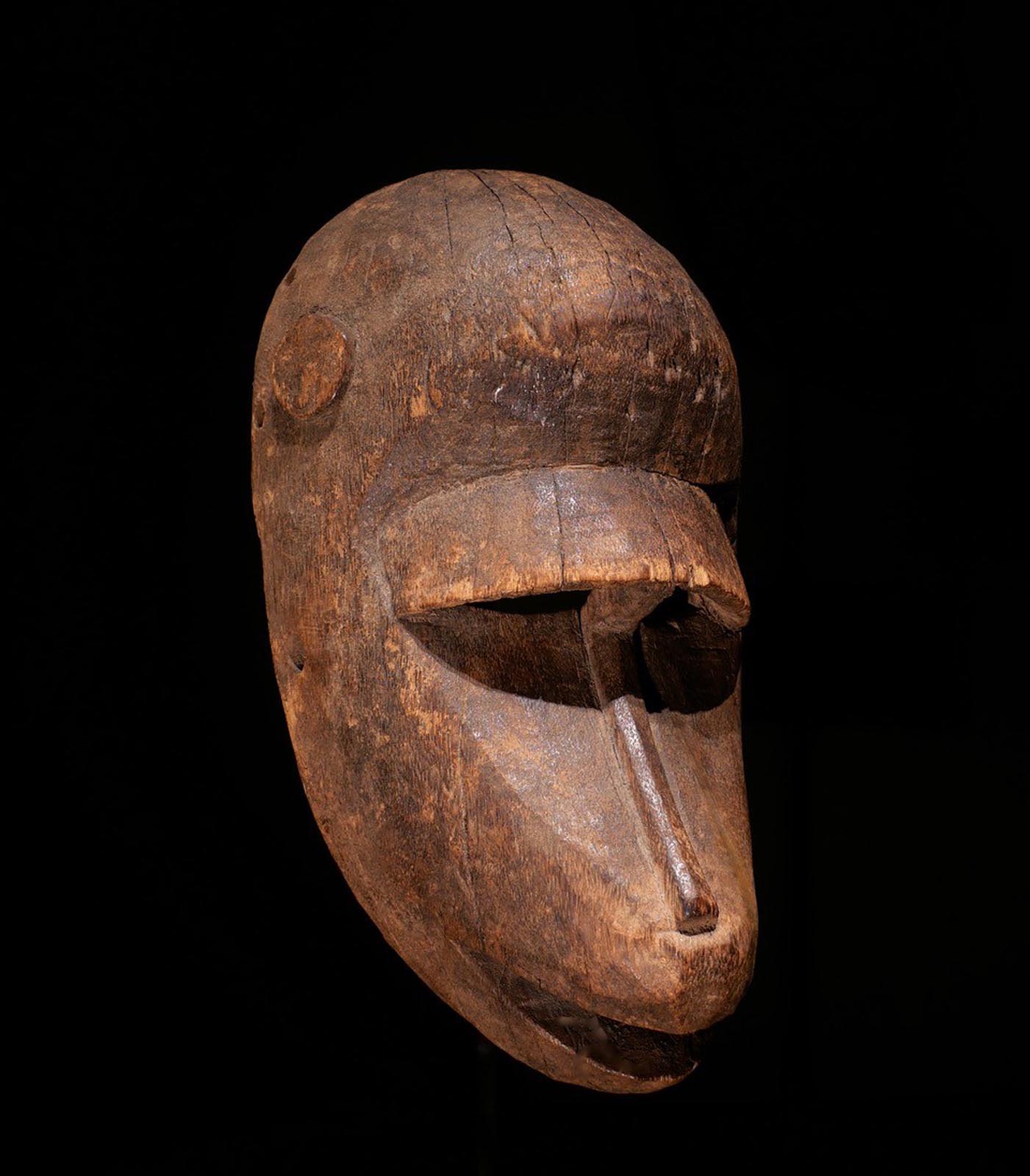 Tanzmaske „Ntomo“. Getanzt bei Initiations-Festen. Holz, dunkle Krusten- Patina. Bambara, Segou-Region / Mali. Frühes 20.Jhdt. Ex. Slg. H. Pfaffhausen, Mannheim. H 30 cm. 2500.- €