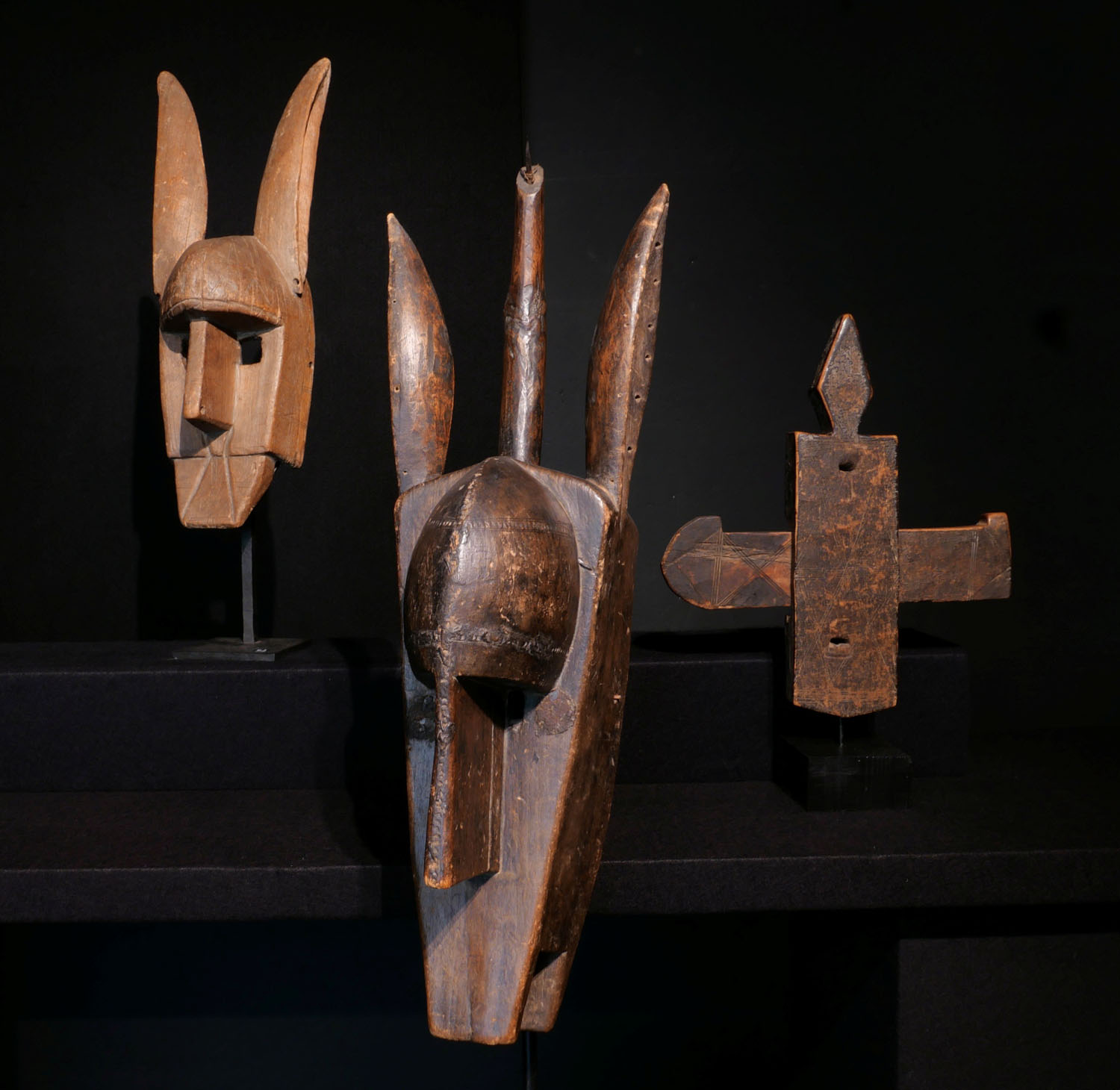 Hirsespeicher-Türe, zwei Tanz-Masken „Gomintogo“ und „Antilope / Walu“, Dogon / Mali. Sistrum, Holz, Kalebassencheiben. Bambara / Mali.