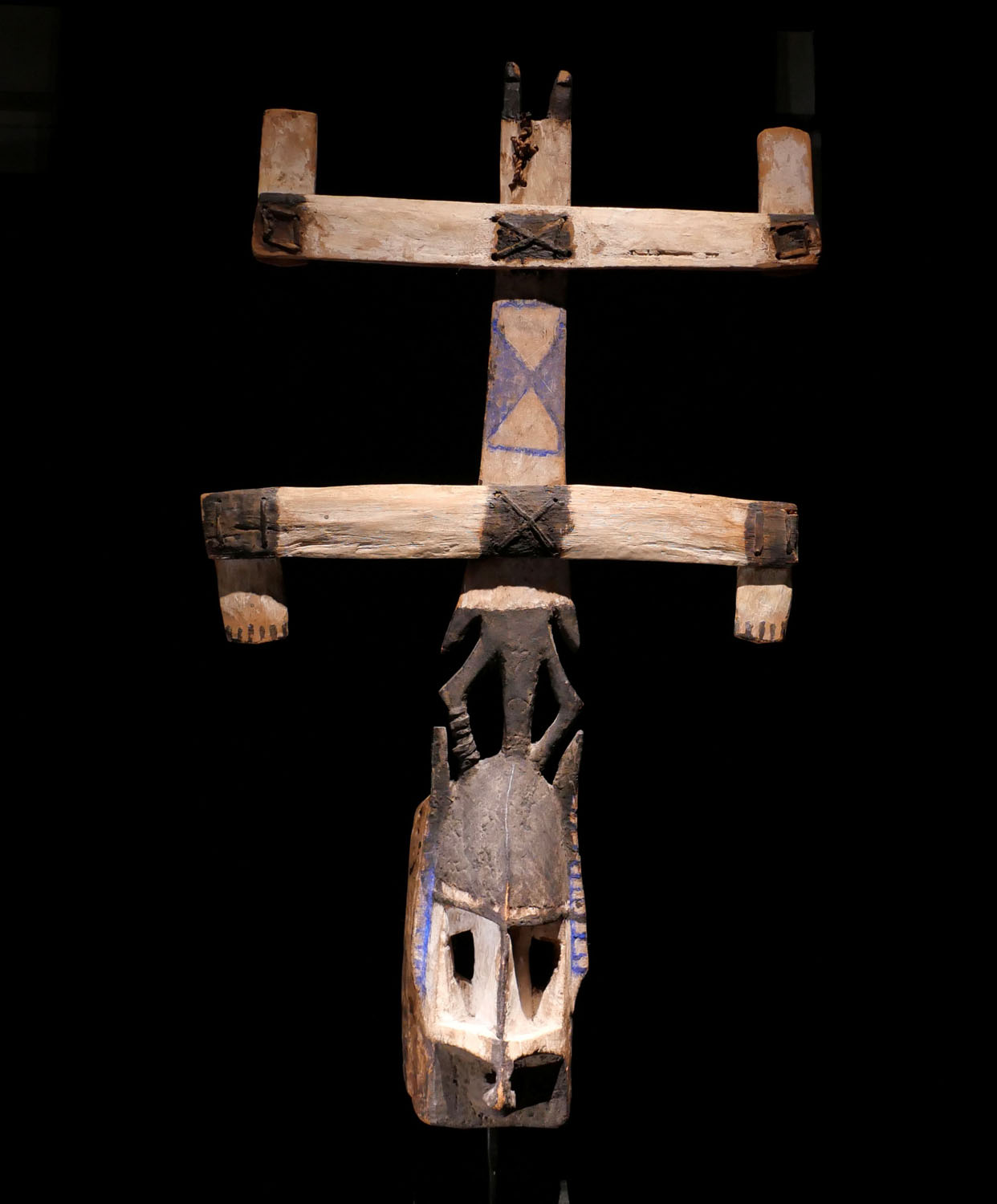Tanzmaske „Kanaga“. Getanzt beim Dama, dem Ritual zu Ehren der Verstorbenen. Holz, Reste von Bemalung mit Pigmentfarben. Dogon, Region Sanga / Mali.