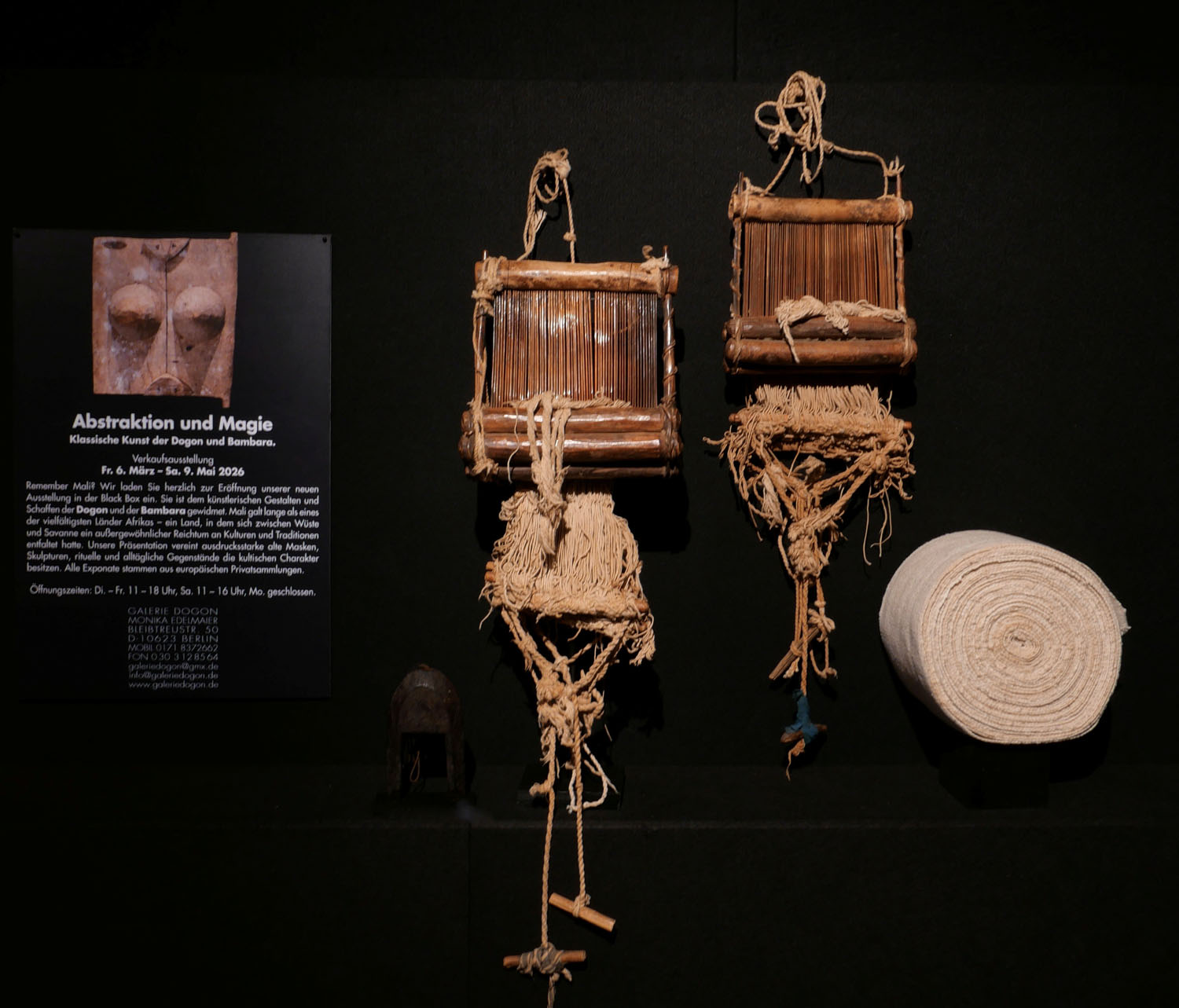 Webkämme, Holz. Mit Litzen und Tritten aus Baumwolle, gewebte Baumwoll-Stoffrolle. Dogon / Mali.