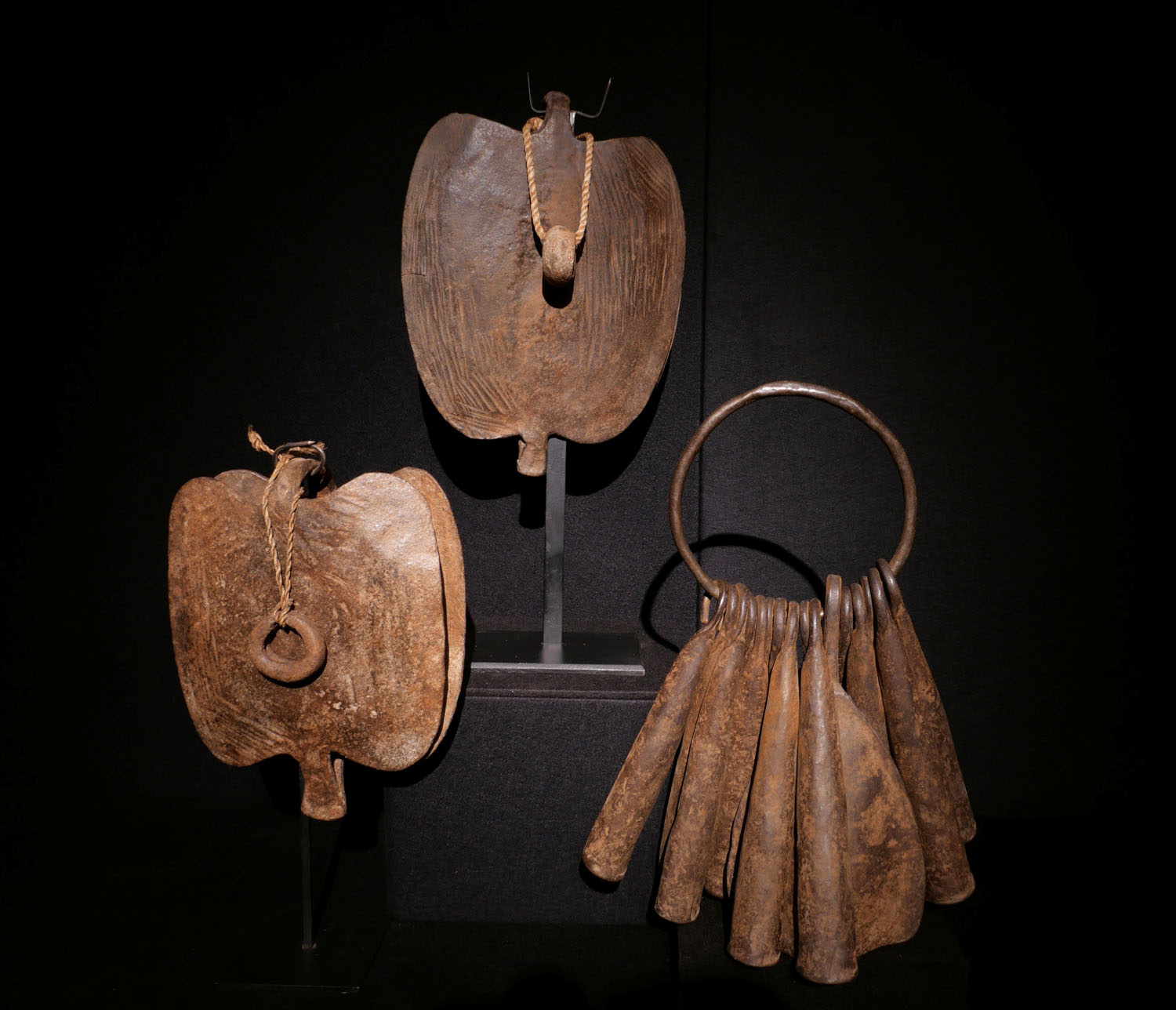 Zwei Gongs mit Schlagringen, Eisen / Nord - Kamerun. Rassel aus Eisen, Yoruba / Nigeria.