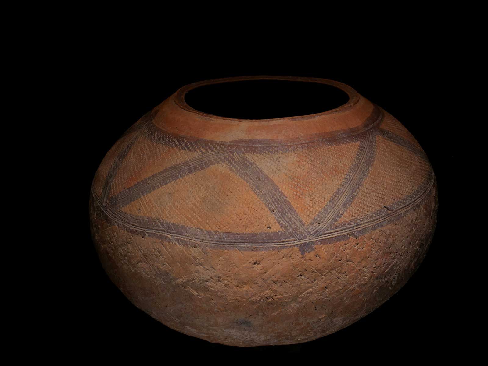 Biergefäß. Terrakotta. Dogon / Mali. Rote Engobe, bemalt mit Erdfarben, Prägemuster. Gebrannt im offenen Feuer. Mitte 20. Jhdt. H 24 cm, D 32 cm. 450.- €